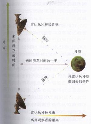 每个观察者都可以用雷达去发出光脉冲或无线电波来测定一个事件在何处何时发生。脉冲的一部分由事件反射回来后,观察者可在他接收到回波时测量时间。事件的时间可认为是发出脉冲和脉冲反射回来被接收的两个时刻的中点;而事件的距离可取这来回过程时间的一半乘以光速。(在这意义上,一个事件是发生在指定空间的一点以及指定时间的一点的某件事。)这个意思已显示在图2.1上。这是时空图的一个例子。利用这个步骤,作相互运动的观察者对同一事件可赋予不同的时间和位置。没有一个特别的观察者的测量比任何其他人更正确,但所有这些测量都是相关的。只要一个观察者知道其他人的相对速度,他就能准确算出其他人该赋予同一事件的时间和位置。