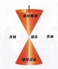 对于给定的事件P,人们可以将宇宙中的其他事件分成三类。从事件P出发由一个粒子或者波以等于或小于光速的速度运动能到达的那些事件称为属于P的未来。它们处于从事件P发射的膨胀的光球面之内或之上。这样,在时空图中它们处于P的未来光锥的里面或上面。因为没有任何东西比光走得更快,所以在P所发生的东西只能影响P的未来的事件。