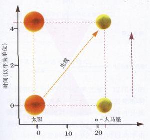 将一个事件的四座标作为在所谓的时空的四维空间中指定其位置的手段经常是有助的。对我来说,摹想三维空间已经足够困难!然而很容易画出二维空间图,例如地球的表面。(地球的表面是两维的,因为它上面的点的位置可以用两个座标,例如纬度和经度来确定。)通常我将使用二维图,向上增加的方向是时间,水平方向是其中的一个空间座标。不管另外两个空间座标,或者有时用透视法将其中一个表示出来。(这些被称为时空图,如图2.1所示。)例如,在图2.2中时间是向上的,并以年作单位,而沿着从太阳到α-半人马座连线的距离在水平方向上以英哩来测量。太阳和α-半人马座通过时空的途径是由图中的左边和右边的垂直线来表示。从太阳发出的光线沿着对角线走,并且要花4年的时间才能从太阳走到α-半人马座。