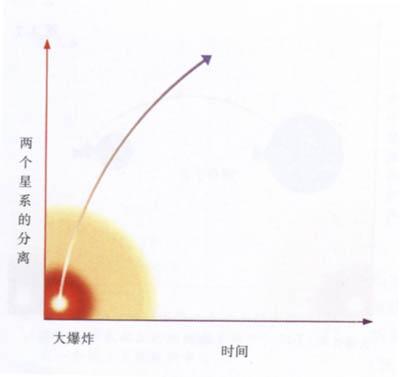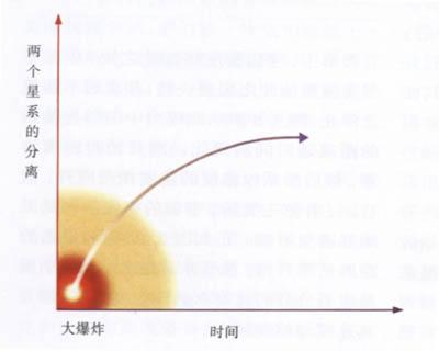虽然弗利德曼只找到一个模型,其实满足他的两个基本假设的共有三种模型。在第一种模型(即弗利德曼找到的)中,宇宙膨胀得足够慢,以至于在不同星系之间的引力使膨胀变慢下来,并最终使之停止。然后星系开始相互靠近,宇宙开始收缩。图3.2表示随时间增加两个邻近的星系的距离的变化。刚开始时距离为零,接着它增长到最大值,然后又减小到零;在第二类解中,宇宙膨胀得如此之快,以至于引力虽然能使之缓慢一些,却永远不能使之停止。图3.3表示此模型中的邻近星系的距离随时间的变化。刚开始时距离为零,最后星系以稳恒的速度相互离开;最后,还有第三类解,宇宙的膨胀快到足以刚好避免坍缩。正如图3.4所示,星系的距离从零开始,然后永远增大。然而,虽然星系分开的速度永远不会变为零,这速度却越变越小。
