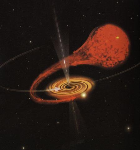 按照黑洞定义,它不能发出光,我们何以希望能检测到它呢?这有点像在煤库里找黑猫。庆幸的是,有一种办法。正如约翰·米歇尔在他1783年的先驱性论文中指出的,黑洞仍然将它的引力作用到它周围的物体上。天文学家观测了许多系统,在这些系统中,两颗恒星由于相互之间的引力吸引而互相围绕着运动。他们还看到了,其中只有一颗可见的恒星绕着另一颗看不见的伴星运动的系统。人们当然不能立即得出结论说,这伴星即为黑洞——它可能仅仅是一颗太暗以至于看不见的恒星而已。然而,有些这种系统,例如叫做天鹅X-1(图6.2)的,也刚好是一个强的X 射线源。对这现象的最好解释是,物质从可见星的表面被吹起来,当它落向不可见的伴星之时,发展成螺旋状的轨道(这和水从浴缸流出很相似),并且变得非常热而发出X射线(图6.3)。为了使这机制起作用,不可见物体必须非常小,像白矮星、中子星或黑洞那样。从观察那颗可见星的轨道,人们可推算出不可见物体的最小的可能质量。在天鹅X-1的情形,不可见星大约是太阳质量的6倍。按照强德拉塞卡的结果,它的质量太大了,既不可能是白矮星,也不可能是中子星。所以看来它只能是一个黑洞。