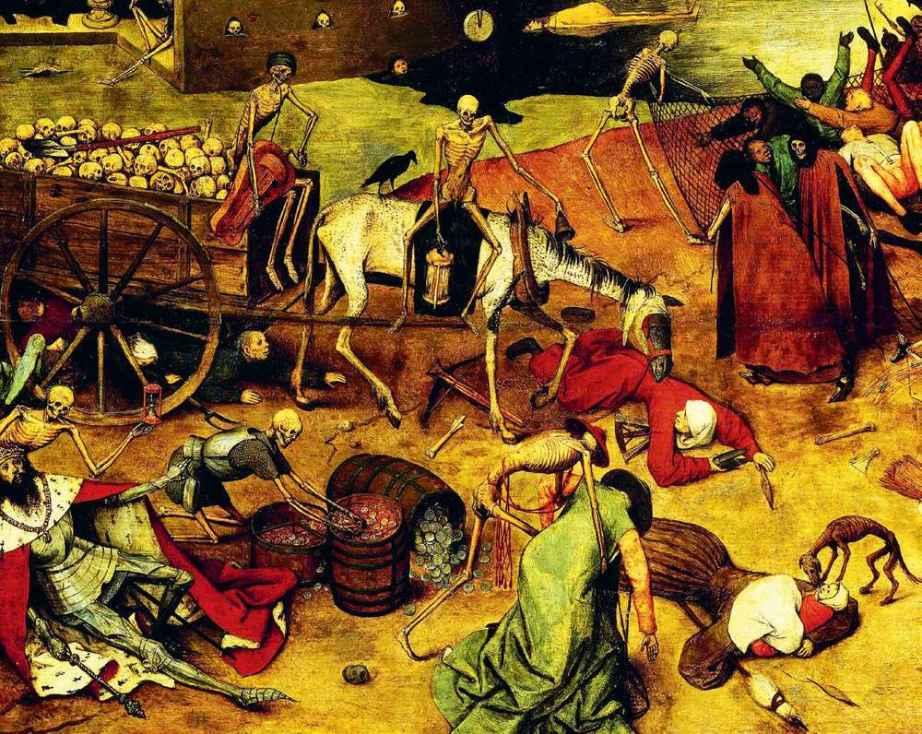 最有名的一次流行病就是黑死病,始于14世纪30年代的东亚或中亚某处,跳蚤携带的鼠疫杆菌(Yersinia pestis)通过跳蚤叮咬而感染人类。这批瘟疫大军借着老鼠和跳蚤,迅速蔓延全亚洲、欧洲和北非,不到20年便抵达大西洋沿岸。当时的死亡人数约为7500万~2亿,超过欧亚大陆人口的四分之一。在英国,每10人就有4人死亡,人口从瘟疫前的370万降到瘟疫后的220万。佛罗伦萨的10万居民,有5万不幸殒命。